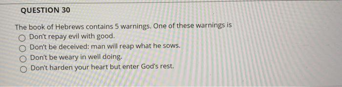 Solved Question 30 The Book Of Hebrews Contains 5 Warnings Chegg Com